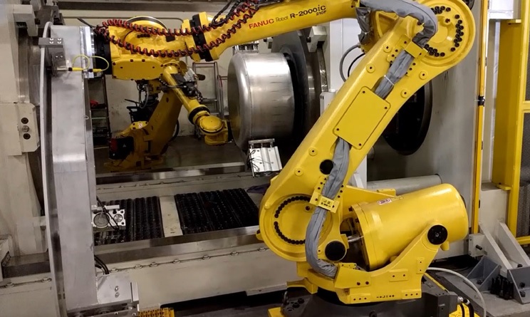 A part-handling robot with specialized end-of-arm tooling works to load and unload large parts into a hydraulic press. Here, the press manufacturer also served as designer and provider of the automation employed in this customized setup.